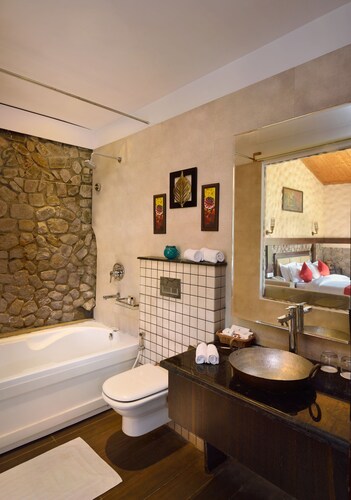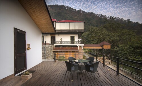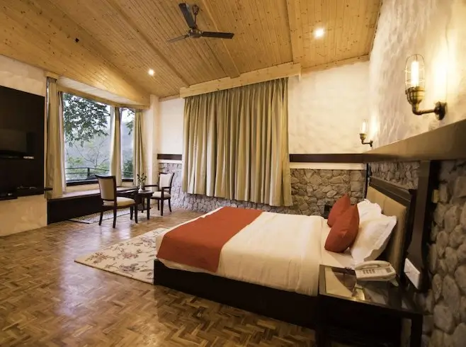 Our Luxury Cottage offers an elegant wooden retreat with a 300 sq. ft. private deck overlooking the valley. Peacefully secluded, it features a luxurious bathtub, premium amenities like a tea/coffee kit, electric kettle, TV, intercom, plush bath linen, and high-end toiletries, ensuring a refined stay.